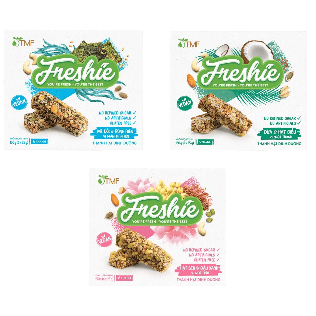 The Freshie Granola Bars 3-Flavors Combo offers a healthy and convenient snacking experience with three delicious varieties: Hạt Each bar is made from whole oats and natural nuts, providing essential energy, fiber, plant-based protein, vitamins, and minerals.
